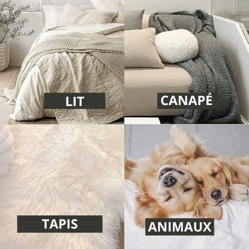 Vous pouvez l'utiliser pour éliminer les poils d'animaux, les peluches, la poussière et la saleté des vêtements, des meubles, des jouets en peluche, des sièges d'auto, des canapés, etc. sans laisser de résidu collant.