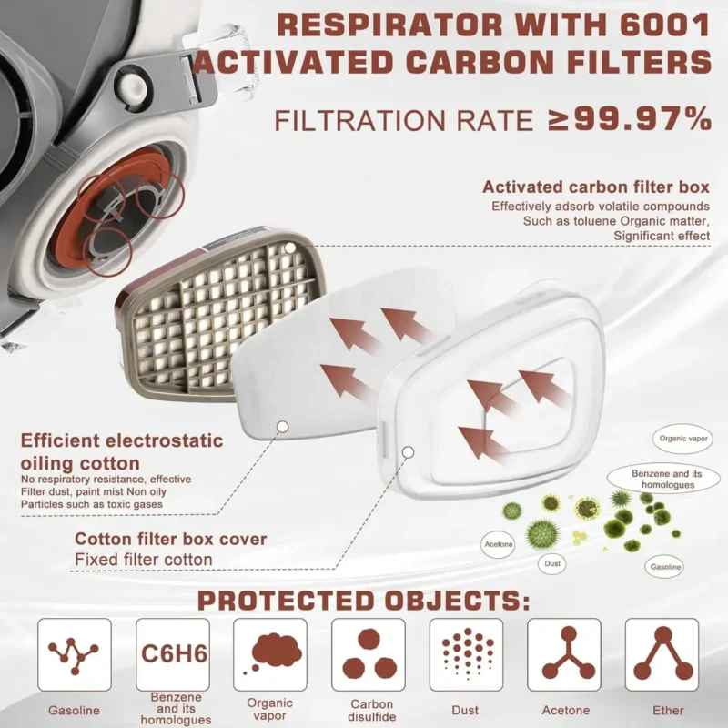 Ce masque utilise un système de double filtration qui bloque efficacement les vapeurs/gaz organiques, la fumée, le pollen, la poussière et autres particules en suspension dans l’air. Il s’agit du dispositif de protection respiratoire idéal pour votre vie quotidienne et professionnelle.